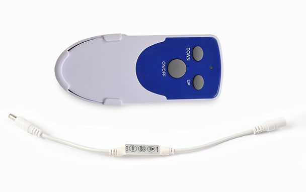 Oben: Mit der handlichen Fernbedienung schalten Sie Ihr Leuchtbild ein und aus und regulieren die Helligkeit.